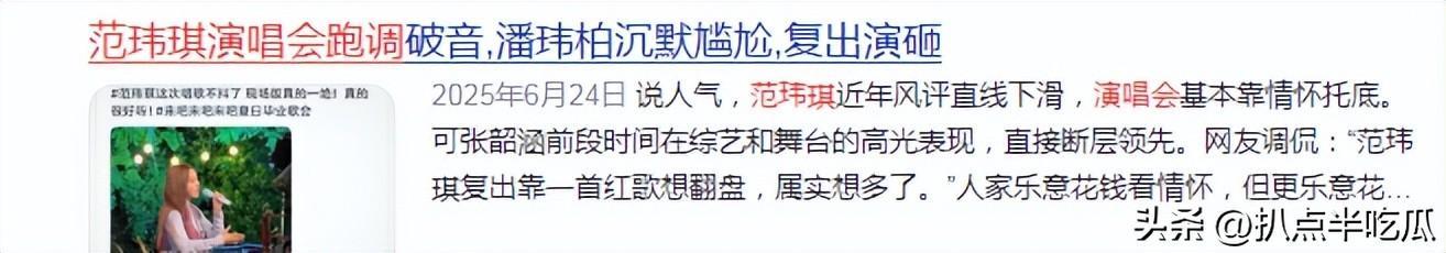 不仅形象摇摇欲坠,范玮琪的演唱水平也因声音发抖、跑调等被质疑“唱功退化”。