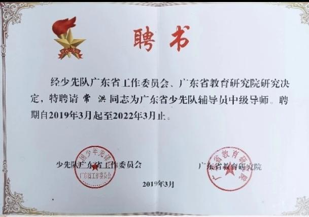付出总有回报。近些年,常洪获得了教育部国家级骨干教师,省、市”十佳”少先队辅导员,全国优秀少先队辅导员,全国少先队名师工作室主持人,广东省少先队辅导员中级导师等少先队专项荣誉。